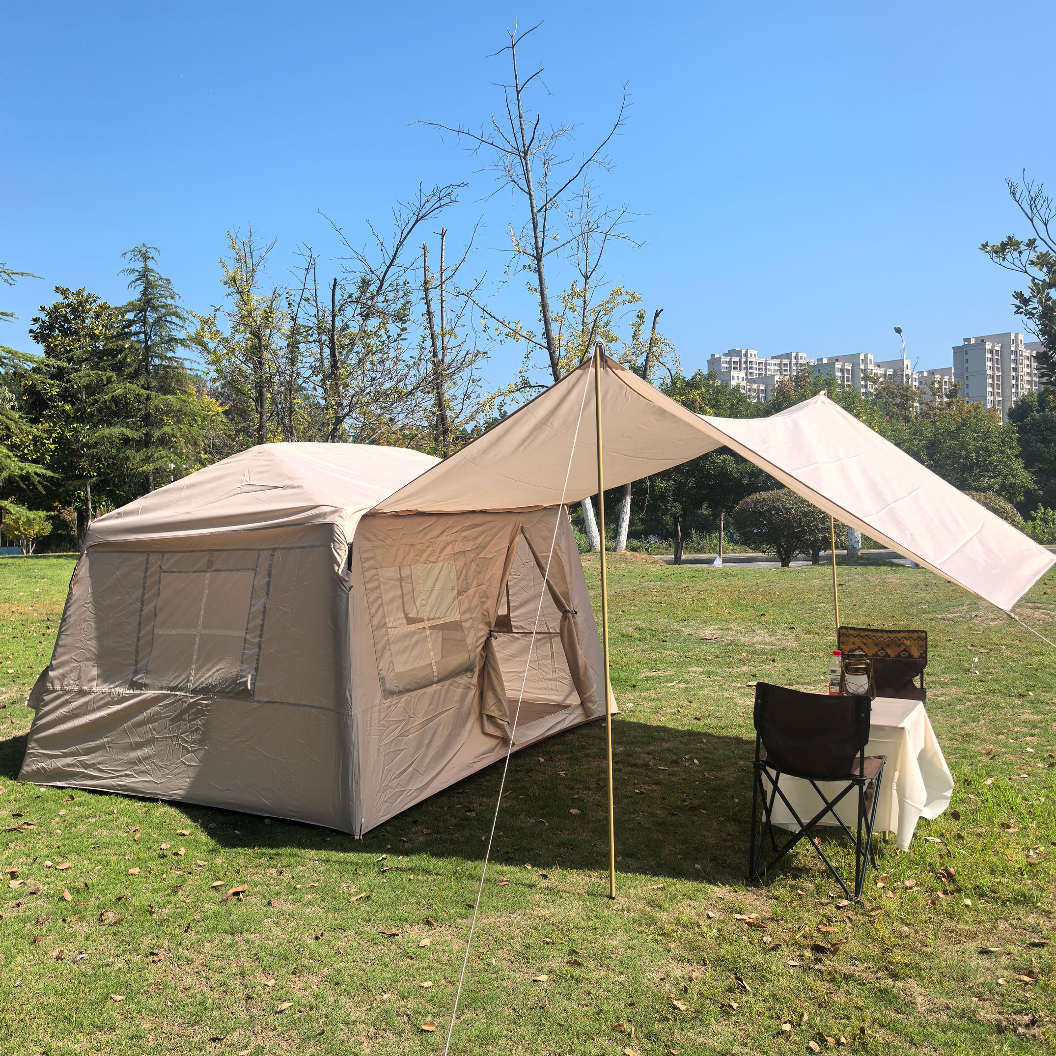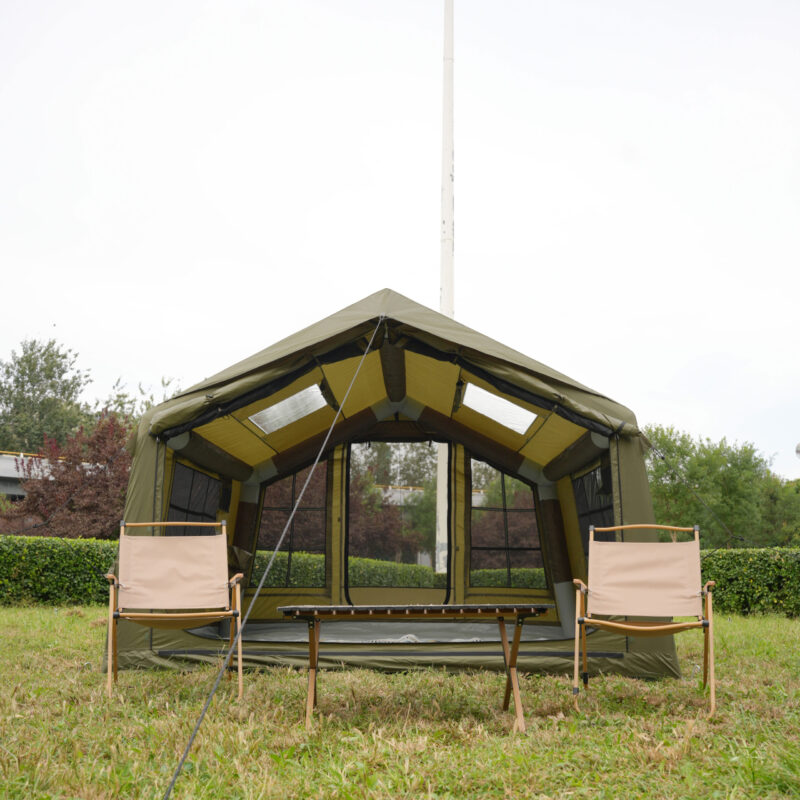 Inside, the tent offers generous living space with optimized height and layout for comfort. Large mesh windows and vent openings ensure excellent airflow and visibility while keeping insects out. The integrated groundsheet, reinforced seams, and heavy-duty anchor points improve overall stability and safety in outdoor environments.